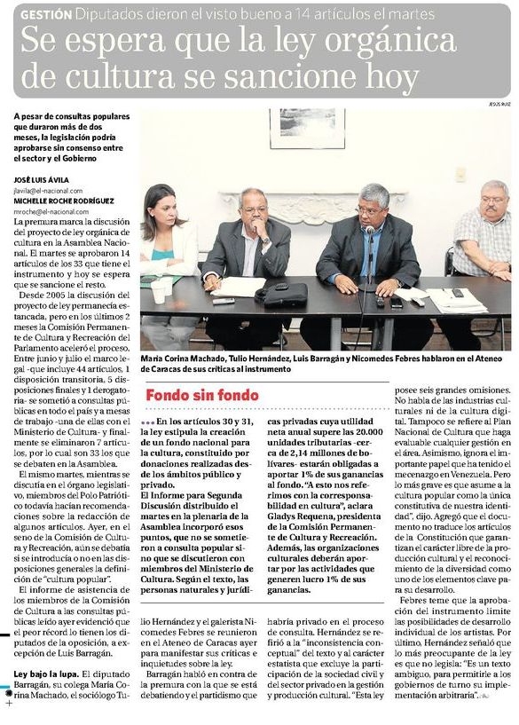 Barragán habló en contra de la premura con la que se está debatiendo y el partidismo que habría privado en el proceso de consulta. Hernández se refirió a la “inconsistencia conceptual” del texto y al carácter estatista que excluye la participación de la sociedad civil y del sector privado en la gestión y producción cultural. “Esta ley posee seis grandes omisiones. No habla de las industrias culturales ni de la cultura digital. Tampoco se refiere al Plan Nacional de Cultura que haga evaluable cualquier gestión en el área. Asimismo, ignora el importante papel que ha tenido el mecenazgo en Venezuela. Pero lo más grave es que asume a la cultura popular como la única constitutiva de nuestra identidad”, dijo. Agregó que el documento no traduce los artículos de la Constitución que garantizan el carácter libre de la producción cultural y el reconocimiento de la diversidad como uno de los elementos clave para su desarrollo.