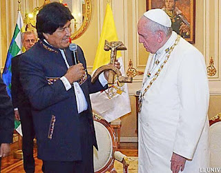 El rostro del sacerdote se alargo sin transmitir una mueca de expresión, solo un pequeño rictus labial que denotaba estupor, enojo, sorpresa, desagrado o quizás desconcierto, que logró captar la cámara del fotógrafo, cuando el Papa Francisco con los brazos caídos a sus costados observó el singular crucifijo que, a manera de regalo y bienvenida, le ofrecía Evo Morales a su invitado.